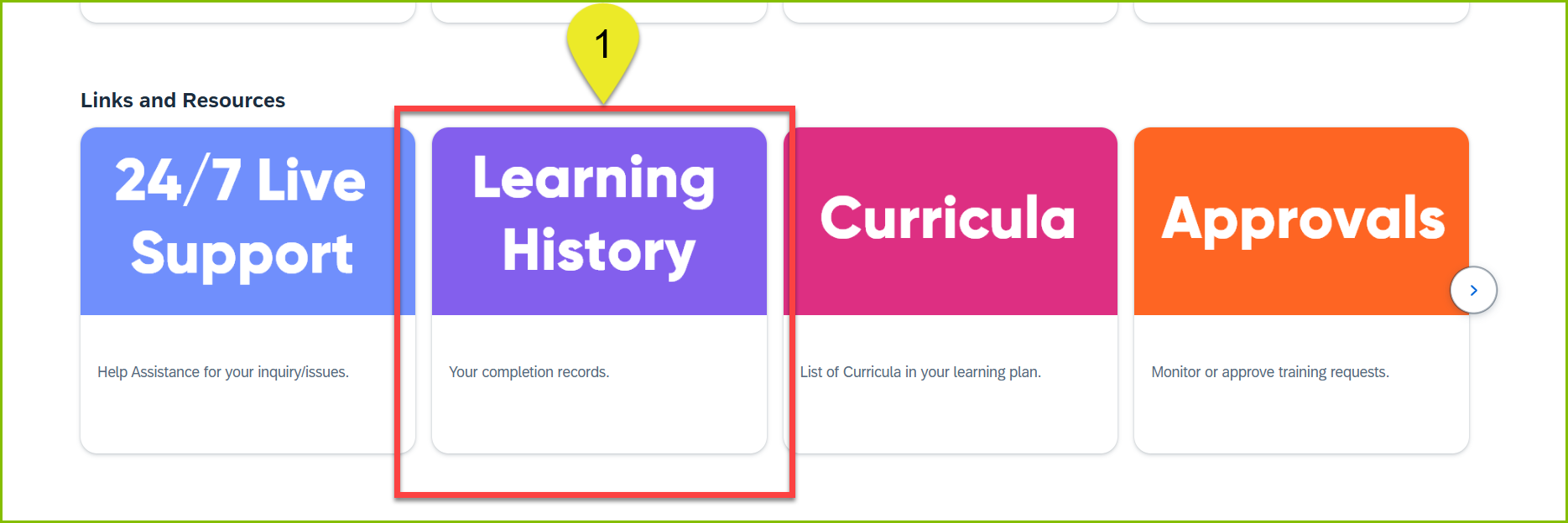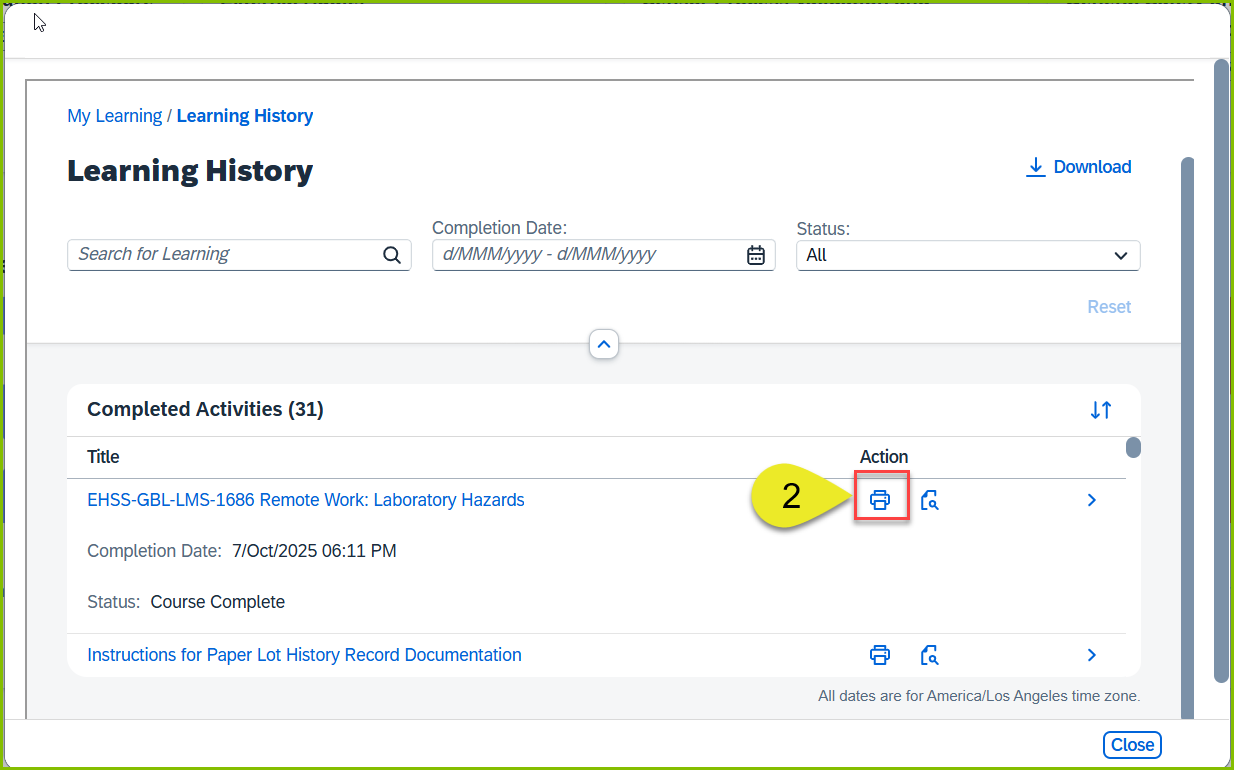 2. Locate the 'Learning History' section to view your completed training. You can view your most recently completed training there or you can select the 'View All' button to get a full listing of your history.