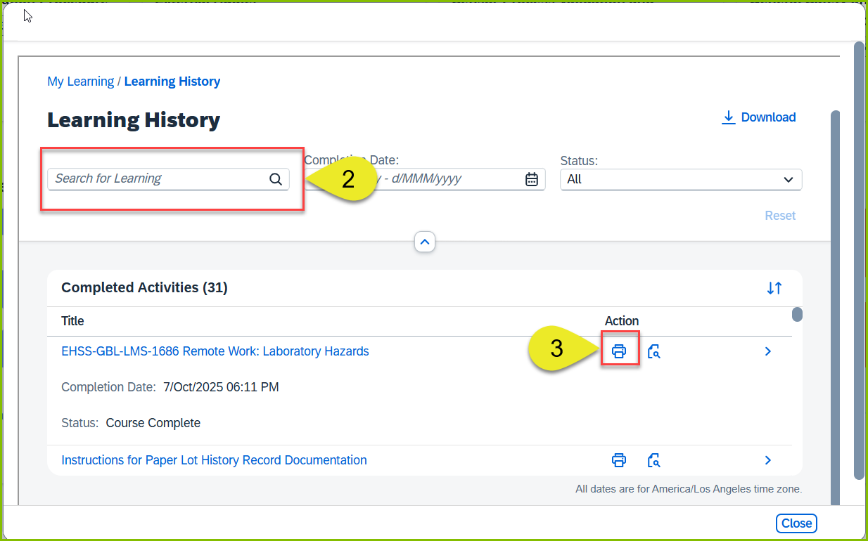 2. From your Learning History page, enter the title of the course in the Search for Learning bar to locate the course you wish to print the certificate for.